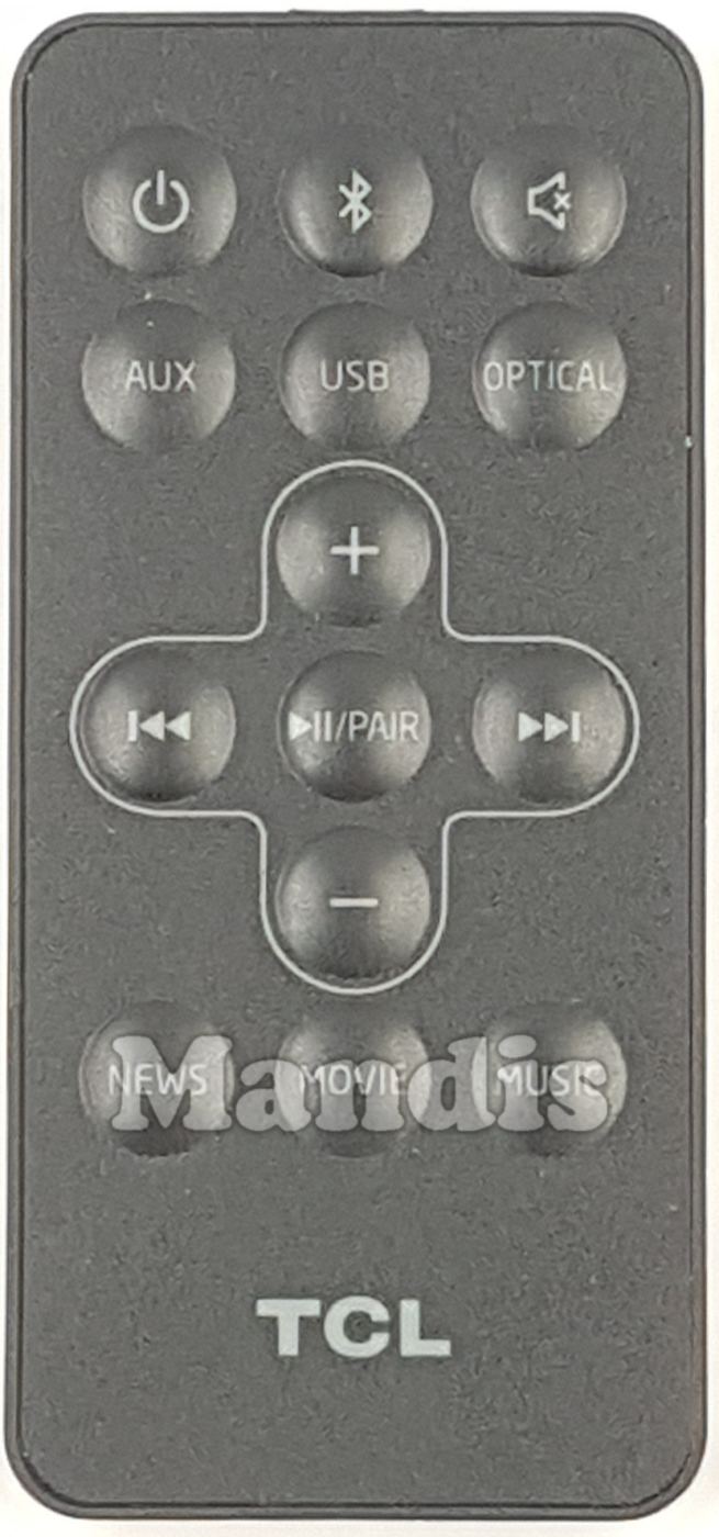 Diese Fernbedienung verfügt über folgende Tasten: Power, Bluetooth, Mute, AUX, USB, Optical, +, -, >>I, I<<, Play/Pause/Pair, News, Movie, Music