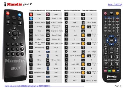 Diese Fernbedienung erfüllt alle Funktionen der Originalfernbedienung: Power, e, Aspect Ratio, Freeze, Hide, Zoom / Mouse Left, Resync, Source / Mouse Right, Up / Keystone Up, Down / Keystone Down, Right, Left, Menu, 1, 2, 3, VGA / 4, Component / 5, Video / 6, S-Video / 7, HDMI / 8, Wireless / 9, Mute / 0, PgUp, PgDn