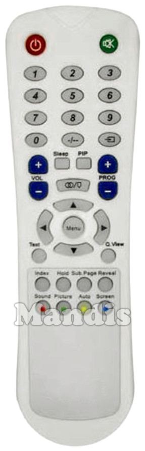 Power, Mute, 1, 2, 3, 4, 5, 6, 7, 8, 9, 0, -/--, Input, Vol+, Vol-, Sleep, PIP, Lang, Prog+, Prog-, Up, Left, Menu, Right, Down, Text, Q.View, Index, Hold, Sub Page, Reveal, Red / Sound, Green / Picture, Yellow / Auto, Blue / Screen