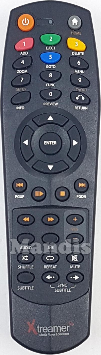 Power, Home, 1 / Add / Red, 2 / Eject / Green, 3 / Delete / Yellow, 4 / Zoom, 5 / Goto / Blue, 6 / Menu, 7 / Setup, 8 / Func, 9 / TV Out, 0 / Preview, Info, Return, Up, Right, Down, Left, Enter, I<< / PGUP, Play / Pause, Stop, >>I / PGDN, <<, >>, Vol +, Vol -, Audio, A-B, Shuffle, Repeat, Mute, Subtitle, Sync Subtitle <-·, Sync Subtitle ·->