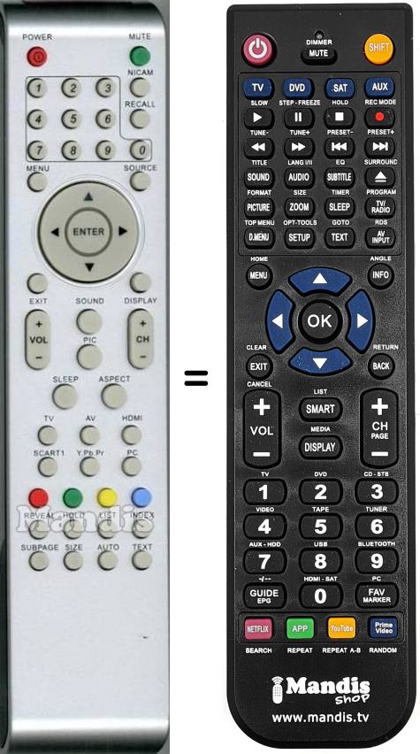 Fernbedienung, die das Original und die Gesamtheit seiner Funktionen, vollständig ersetzt. Es handelt sich jedoch nicht um eine Universalfernbedienung sondern um eine Fernbedienung die das Original ersetzt. Sie erhalten eine nach Einlegen der Batterien sofort einsatzbereite Fernbedienung. Jegliches Programmieren entfällt. Wir geben umfassende Garantie dafür, dass diese Fernbedienung alle Funktionen der Originalfernbedienung erfüllt.
