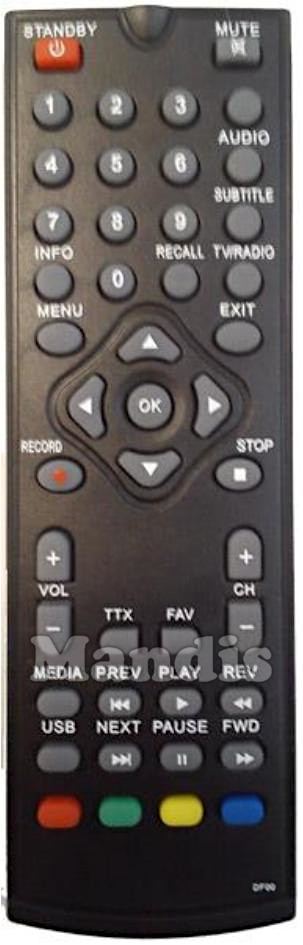 Standby, Mute, 1, 2, 3, 4, 5, 6, 7, 8, 9, 0, Info, Recall, Audio, Subtitle, TV / Radio, Menu, Exit, Up, Right, Down, Left, OK, Record, Stop, Vol +, Vol -, TTX, FAV, CH +, CH -, Media, I<< Prev, Play, << REV, USB, Next >>I, Pause, FWD >>, Red, Green, Yellow, Blue,