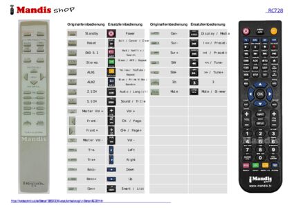 Ein Dokument ist enthalten, um die Verwendung der neuen Fernbedienung zu erleichtern, indem es die Tastenbelegung zeigt.
