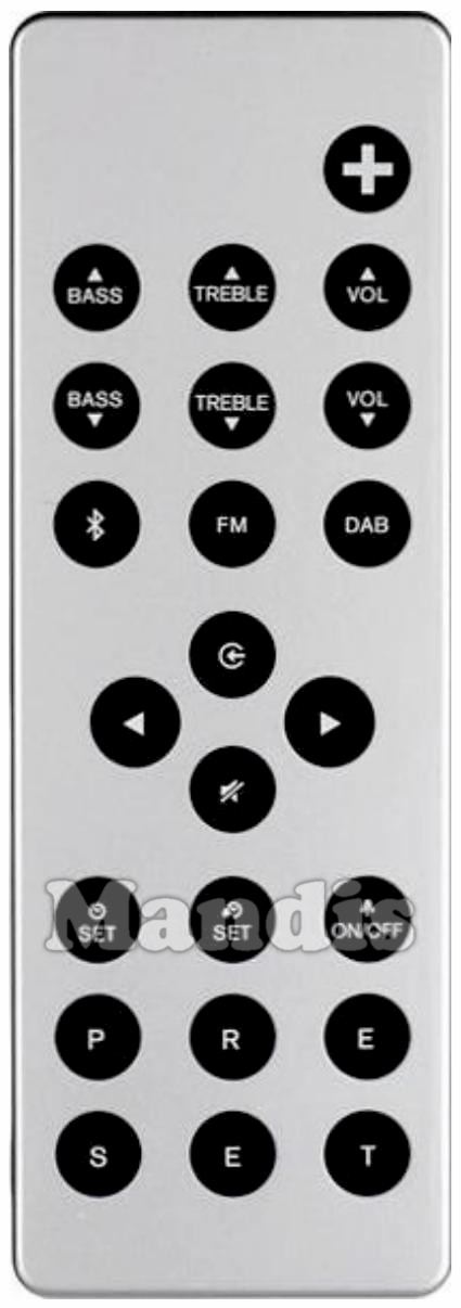 +, Bass +, Bass -, Trebble +, Trebble -, Vol +, Vol -, Bluetooth, FM, DAB, Input, Left, Right, Mute, Clock Set, Alarm Clock Set, Alarm On / Off, P, R, E (up), S, E (down), T