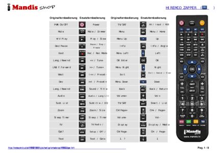 Ein Dokument ist enthalten, um die Verwendung der neuen Fernbedienung zu erleichtern, indem es die Tastenbelegung zeigt.