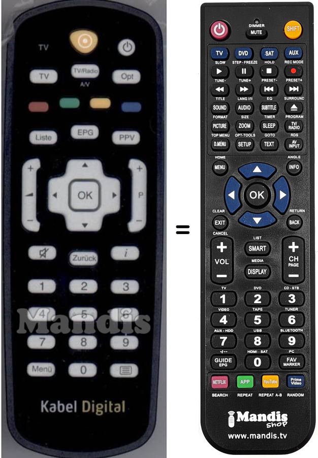 Die Fernbedienung ersetzt das Original KabelDigital (014350080) in der Gesamtheit seiner Funktionen.