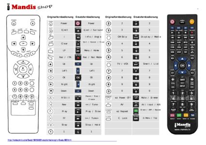 Im Folgenden zeigen wir Ihnen die Zuordnung jedes einzelnen Knopfes der Originalfernbedienung zu der Taste, die dieselbe Funktion auf der Ersatzfernbedienung ausführt. In einigen Fällen müssen Sie möglicherweise die UMSCHALT-Taste drücken, bevor Sie eine andere Taste drücken, um bestimmte Aktionen auszuführen. Diese zusätzlichen Funktionen werden oft wenig genutzt und dienen dazu, das Verständnis der Ersatzfernbedienung zu erleichtern oder weil die Originalfernbedienung mehr Tasten hat als das entsprechende Modell.