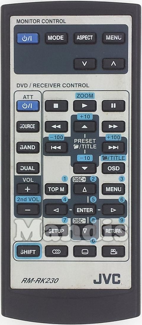 Power, Mode, Aspect, Menu, Up, Down, Power ATT, Source, Band, Dual, Vol/2nd Vol+, Vol/2nd Vol-, Shift, Stop, Pause, Play/Zoom, Preset/Title Up/+10, Preset/Title Down/-10, >>, <<, I<</-100, >>I/+100, OSD/Title, Top M/1, Up/Disc+/2, Down/Disc-/8, Menu/3, Left/4, Enter/5, Right/6, Return/9, Setup/7, [...]/0, O)), Camera/Angle