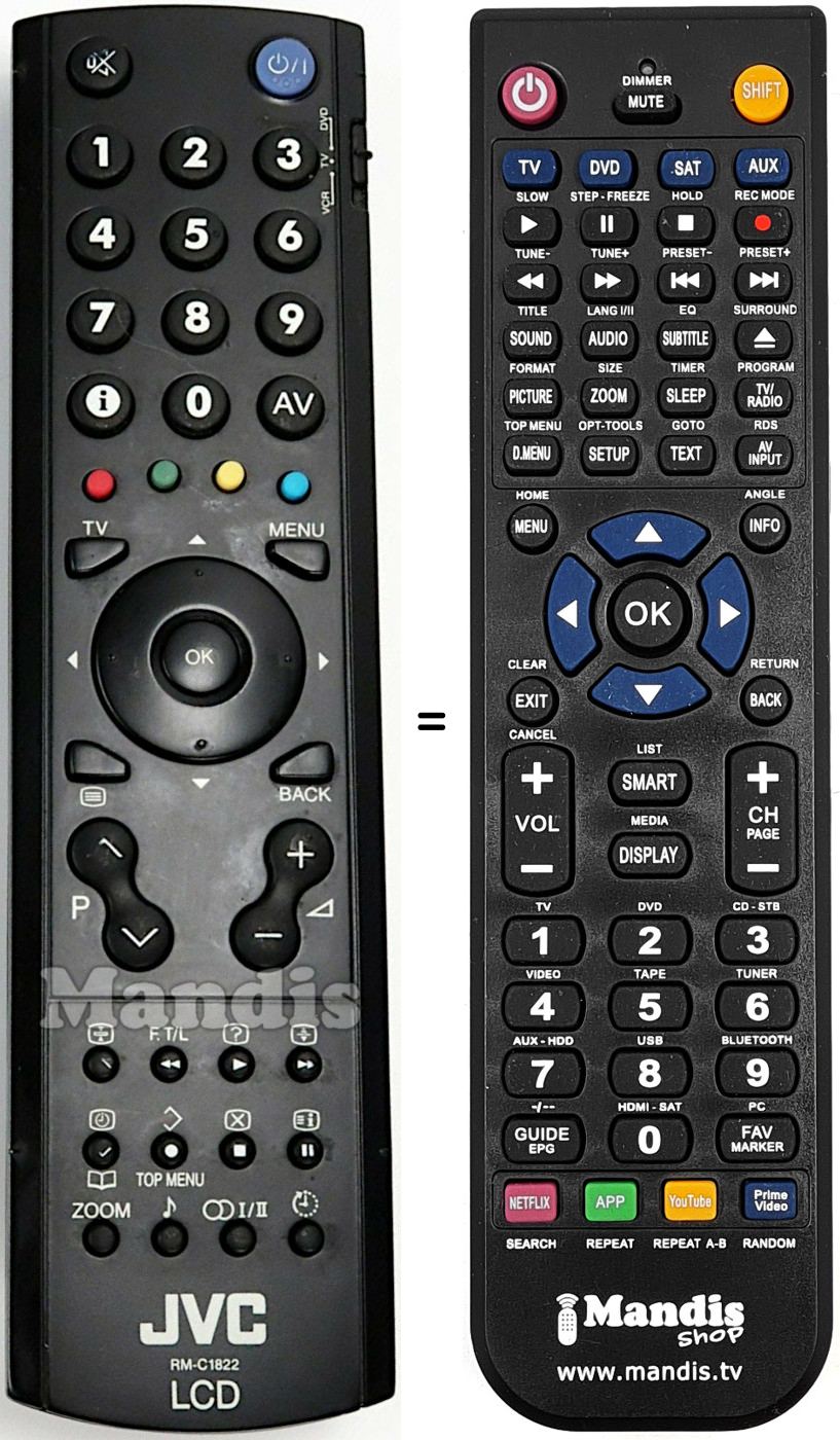 Die Fernbedienung ersetzt das Original RM-C1822 (RMC1822B1C) in der Gesamtheit seiner Funktionen.