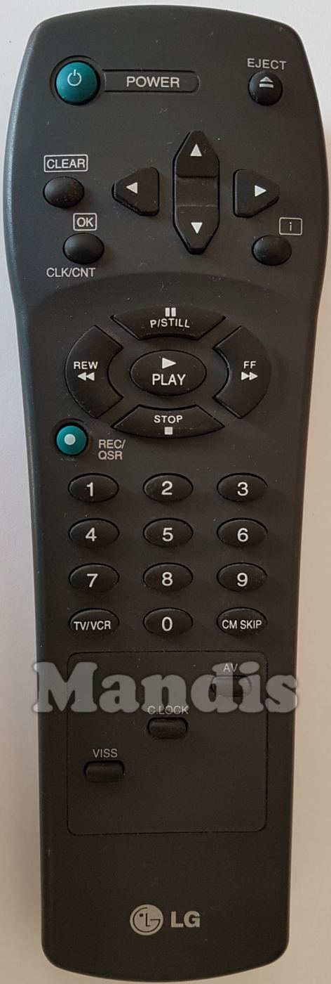 Power, Eject, Clear, OK/CLK/CNT, Up, Down, Left, Right, i, Pause/P/Still, Stop, <<, >>, Play, REC/QSR, 1, 2, 3, 4, 5, 6, 7, 8, 9, 0, TV/VCR, CM Skip, Viss, C.Lock, AV