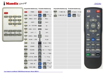 Im Folgenden zeigen wir Ihnen die Zuordnung jedes einzelnen Knopfes der Originalfernbedienung zu der Taste, die dieselbe Funktion auf der Ersatzfernbedienung ausführt. In einigen Fällen müssen Sie möglicherweise die UMSCHALT-Taste drücken, bevor Sie eine andere Taste drücken, um bestimmte Aktionen auszuführen. Diese zusätzlichen Funktionen werden oft wenig genutzt und dienen dazu, das Verständnis der Ersatzfernbedienung zu erleichtern oder weil die Originalfernbedienung mehr Tasten hat als das entsprechende Modell.