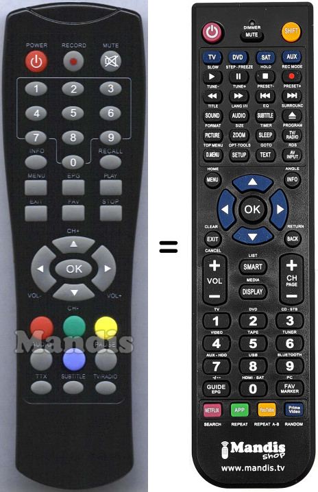 Fernbedienung, die das Original und die Gesamtheit seiner Funktionen, vollständig ersetzt.