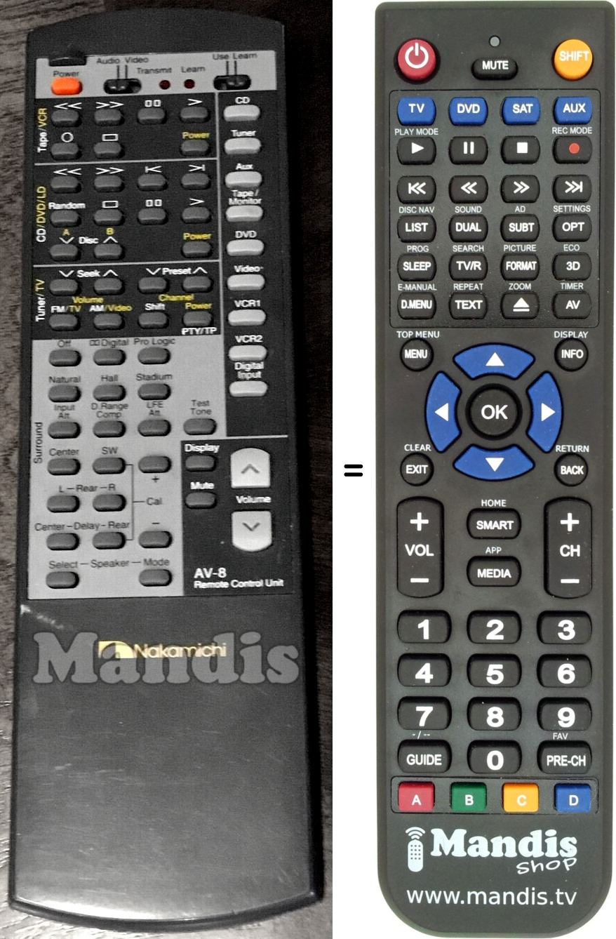 Diese Fernbedienung ersetzt die meisten Funktionen Ihres AV-8. Es ist keine Universalfernbedienung, sondern eine Kopie mit den meisten Tasten und Funktionen Ihres Originals.