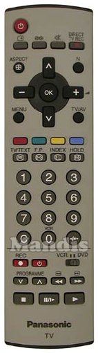 Power, [ +], (<I>), Mute, Direct Tv Rec, [+]/Aspect, N, Up, Down, Vol+, Vol-, OK, Menu, TV/AV, Red, Green, Yellow, Blue, TV/Text, [=♦]/F.P., [=i]/Index, [=+]/Hold, 1, 2, 3, 4, 5, 6, 7, 8, 9, o/VCR, C, -/--, Rec, Power VCR/DVD, Programme Down, Programme Up, <<, >>, Stop, Pause/Step, Play