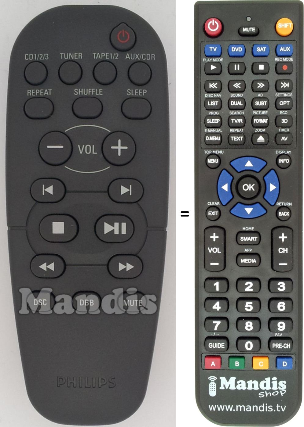 Power , CD1/2/3, Tuner, Tape1/2, AUX/CDR, Repeat, Shuffle, Sleep, Vol-, Vol+, I<, >I, Stop , Play/Pause, << , >>, DSC, DBB, Mute
