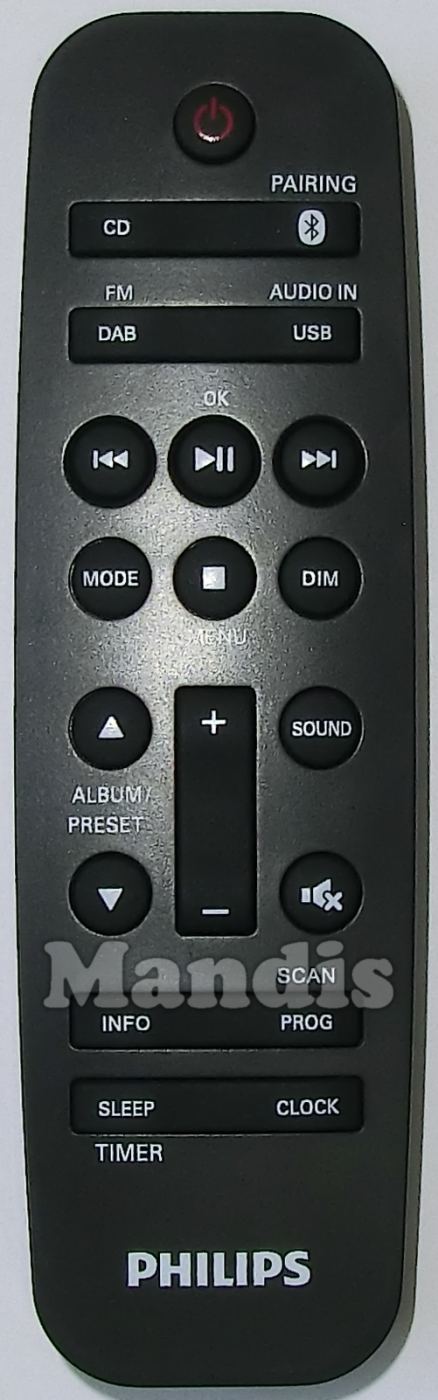 power, cd, bluetooth/pairing, dab/fm, usb/audio in, i<<, play/pause, >>I, mode, stop, dim, Album/Preset Up , Album/Preset Down, sound, mute, vol+, vol-, info, prog/scan, sleep/ timer, clock