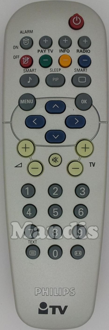 Power, Alarm On, Alarm Off/Red, Pay TV+, Pay TV-/Green, Info+, Info-/Yellow, Radio+, Radio-/Blue, ♪/Smart, PIP/Sleep, ▭/Smart, Menu, OK, Up, Down, Left, Right, Vol+, Vol-, Mute, TV+, TV-, 1, 2, 3, 4, 5, 6, 7, 8, 9, 0, [≡]/Text, [<>]