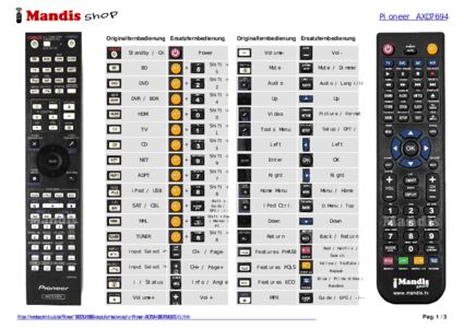 Diese Fernbedienung erfüllt alle Funktionen der Originalfernbedienung: Standby / On, All Zone Stby / Discrete On / RCU Setup, Source Power, BD, DVD, DVR / BDR, HDMI, TV, CD, NET, ADPT, iPod / USB, SAT / CBL, MHL, TUNER, ← Input Select, Input Select →, i / Status, Receiver, TV Power, TV Input, TV CH+, TV CH-, TV Vol+, TV Vol-, Volume+, Volume-, Mute, Audio Parameter / Top Menu, Video Parameter / Tools / Menu, Up, Left, Enter, Right, Down, Home Menu / iPod CTRL, Return, PHASE, PCTRL+, PQLS, ECO, Pause / MPX, Play / Band, Stop / PTY, I<< / Preset-, >>I / Preset+, << / Tune-, >> / Tune+, 1 / Auto / ALC / Direct, 2 / Standard, 3 / Adv Surr, 4 / Signal Sel, 5 / MCACC, 6 / CH Level, 7 / Speakers, 8 / Dimmer, 9 / Sleep, 0 / HDMI Out, Rec / CLR / D.Access, Enter / Class, Audio / +Favorite, Disp / Auto S.RTRV, CH+ / Repeat, CH- / Random, Zone 2, Zone 3, HD Zone, Option