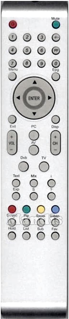 Power, Mute, 1, 2, 3, 4, 5, 6, 7, 8, 9, 0, -/--, PP, Menu, Epg, Up, Left, Enter, Right, Down, Exit, Disp, PC, AV, Vol+, Vol-, CH+, CH-, Dvb, TV, Text, Mix, i, Exp, S, ?, Red, Green, Yellow, Blue, Sound, Pip, Swap, Sleep, Hold, List, Sub, Fav