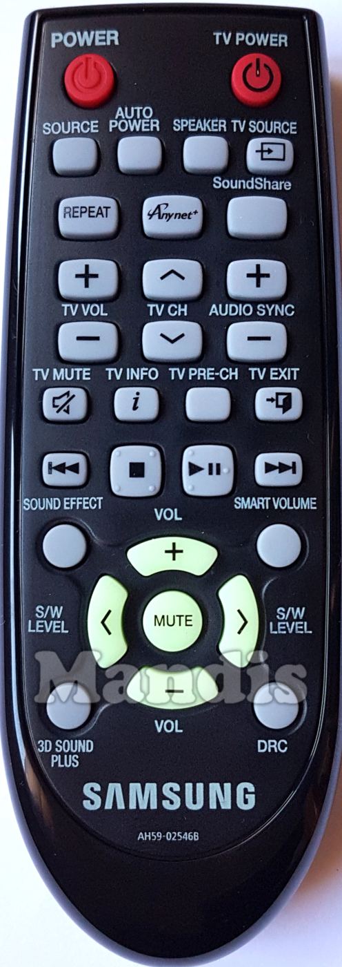 Power, TV Power, Source, Auto Power, Speaker, TV Source, Repeat, Anynet, SoundShare, TV Vol +, TV Vol -, TV Ch +, TV Ch -, Audio Sync +, Audio Sync -, TV Mute, TV Info, TV Pre-Ch, TV Exit, I<<, >>I, Stop, Play / Pause, Sound Effect, Smart Volume, Up / Vol +, Down / Vol -, Right / S/W Level +, Left / S/W Level -, 3D Sound Plus, DRC, Mute
