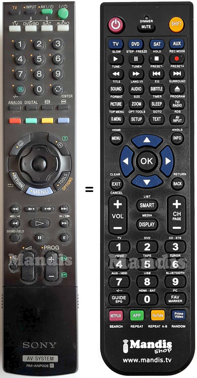 Diese Fernbedienung ersetzt die meisten Funktionen Ihres RM-ANP006. Es ist keine Universalfernbedienung, sondern eine Kopie mit den meisten Tasten und Funktionen Ihres Originals.