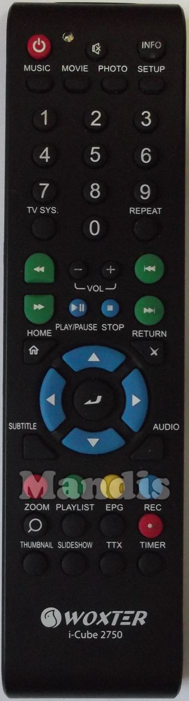 Fernbedienung Original ICube2750 zur Steuerung der Multimedia Festplatten der Marke Woxter. Es handelt sich um eine Originalfernbedienung.