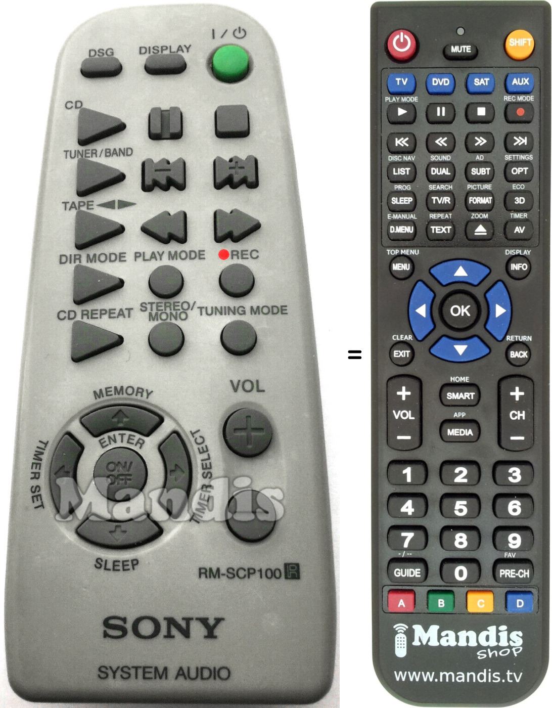 Below, we will show you the correspondence between each button on the original remote control and the button that performs the same function on the replacement remote control. In some cases, you may need to press the SHIFT key before pressing another button to perform certain actions. These additional functions are often not widely used and are included to facilitate understanding of the replacement remote control, or because the original remote control has more buttons than its equivalent.