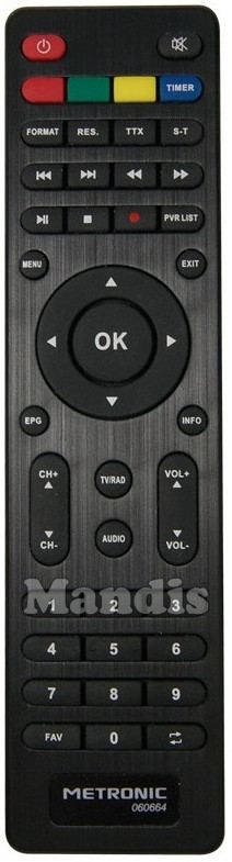 Power, Mute, Red, Green, Yellow, Blue / Timer, Format, RES., TTX, S-T, I<<, >>I, <<, >>, Play / Pause, Stop, Rec, PVR List, Menu, Exit, Up, Right, Down, Left, OK, EPG, Info, CH +, CH -, TV / RAD, Audio, Vol +, Vol -, 1, 2, 3, 4, 5, 6, 7, 8, 9, 0, FAV, Recall