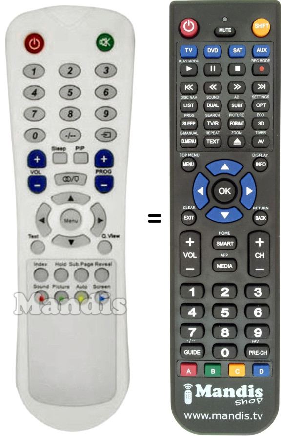 Below, we will show you the correspondence between each button on the original remote control and the button that performs the same function on the replacement remote control. In some cases, you may need to press the SHIFT key before pressing another button to perform certain actions. These additional functions are often not widely used and are included to facilitate understanding of the replacement remote control, or because the original remote control has more buttons than its equivalent.