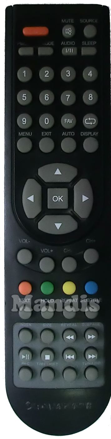 Power, Mute, Source, PMode, SMode, I/II/Audio, Sleep, 1, 2, 3, 4, 5, 6, 7, 8, 9, 0, FAV, Recall, Menu, Exit, Auto, Display, Up, Down, Left, Right, OK, Vol-, Vol+, CH-, CH+, Red, Green, Yellow, Blue, Text, Hold, Repeat, Subtitle, Index, Size, <</Reveal, >>/Subpage, Play/Pause, Stop, I<<, >>I, Rec, Timeshift, Nothing, Tv/Radio