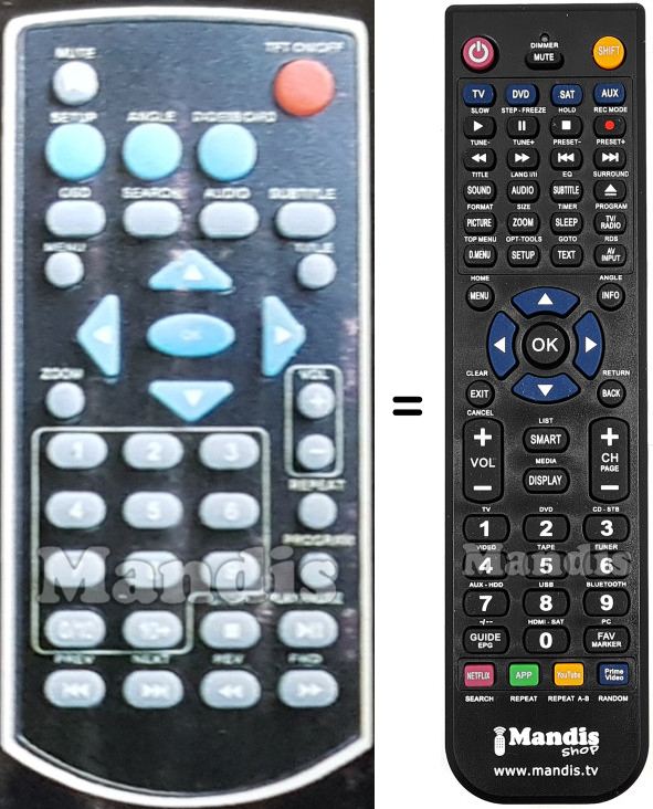 Below, we will show you the correspondence between each button on the original remote control and the button that performs the same function on the replacement remote control. In some cases, you may need to press the SHIFT key before pressing another button to perform certain actions. These additional functions are often not widely used and are included to facilitate understanding of the replacement remote control, or because the original remote control has more buttons than its equivalent.