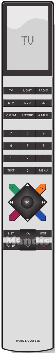 TV, DTV, DVD, RECORD, 7, 8, 9, 4, 5, 6, 1, 2, 3, 0, Text, Menu, Up, Down, Right, Left, GO, Red, Green, Yellow, Blue, List, Exit, Vol +, Vol -, Mute, Stop, Standby, Radio, CD, A MEM, V Mem