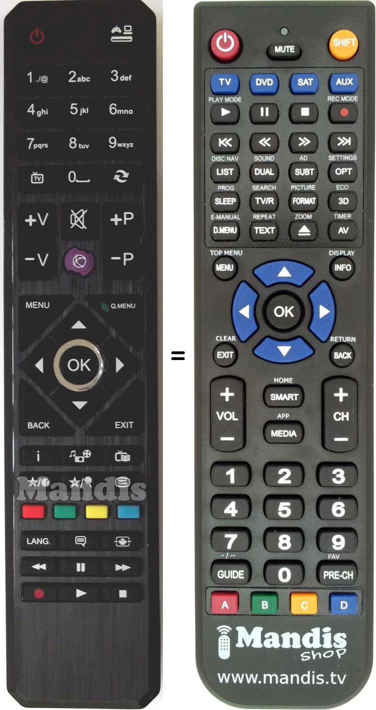 Below, we will show you the correspondence between each button on the original remote control and the button that performs the same function on the replacement remote control. In some cases, you may need to press the SHIFT key before pressing another button to perform certain actions. These additional functions are often not widely used and are included to facilitate understanding of the replacement remote control, or because the original remote control has more buttons than its equivalent.