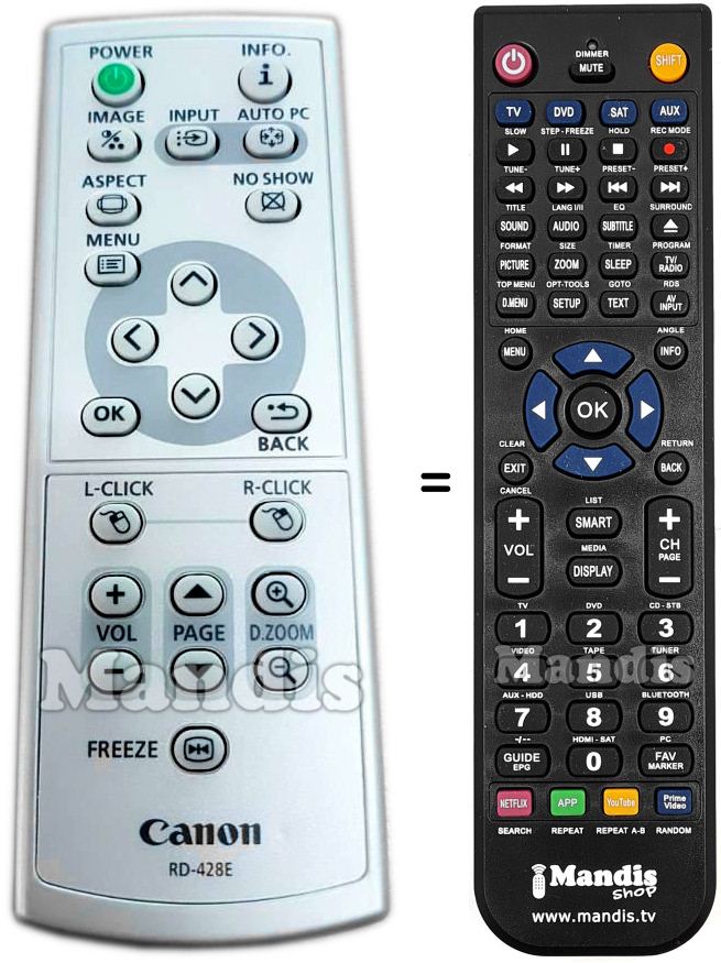 Below, we will show you the correspondence between each button on the original remote control and the button that performs the same function on the replacement remote control. In some cases, you may need to press the SHIFT key before pressing another button to perform certain actions. These additional functions are often not widely used and are included to facilitate understanding of the replacement remote control, or because the original remote control has more buttons than its equivalent.