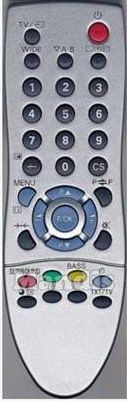 Power, Tv/AV, [ .]/[=?], Timer, Mute, 1, 2, 3, 4, 5, 6, 7, 8, 9, -/--/[=o], 0, P↔P/[=+], Menu, Sound, Up/CH+, Down/CH-, Right/Vol+, Left/Vol-, OK, ▼ A-B, Picture, [=♦]/Bass, TXT/TV, S.SYS, Surround, Red, Green, Yellow, Blue