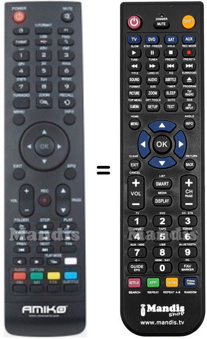 Below, we will show you the correspondence between each button on the original remote control and the button that performs the same function on the replacement remote control. In some cases, you may need to press the SHIFT key before pressing another button to perform certain actions. These additional functions are often not widely used and are included to facilitate understanding of the replacement remote control, or because the original remote control has more buttons than its equivalent.