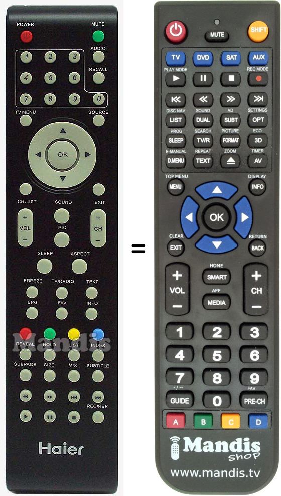 This remote control performs all the functions of the original remote control: Power, Mute, Audio, Recall, 1, 2, 3, 4, 5, 6, 7, 8, 9, 0, Source, Tv Menu, Exit, CH.List, Sound, PIC, Aspect, Sleep, Vol+, Vol-, CH+, CH-, Up, Down, Right, Left, OK, Freeze, Tv/Radio, Text, EPG, FAV, Info, Red, Green, Yellow, Blue, Reveal, Hold, List, Index, Subpage, Size, Mix, Subtitle, <<, >>, I<<, >>I, Play, Pause, Stop, Rec/Rep