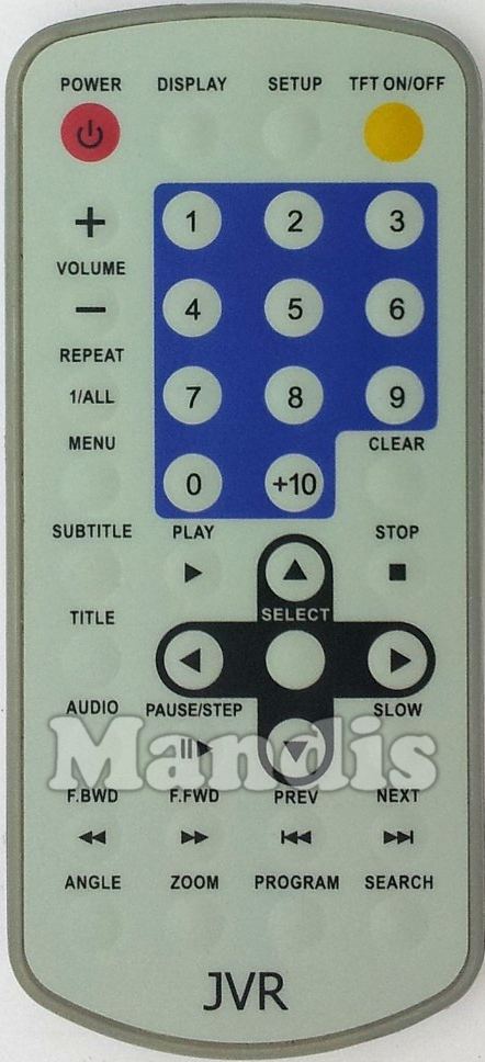 Power, Display, Setup, TFT ON/OFF, Volume+, Volume-, 1/ALL/Repeat, Menu, Subtitle, Title, Audio, 1, 2, 3, 4, 5, 6, 7, 8, 9, 0, +10, Clear, Play, Stop, Pause/Step, Slow, Up, Down, Left, Right, Select, <<, >>, I<<, >>I, Angle, Zoom, Program, Search