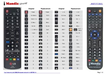 This remote control performs all the functions of the original remote control: Power, TV / Rad, Input, Q.Menu, Ratio, Subtitle, 1, 2, 3, 4, 5, 6, 7, 8, 9, 0, Guide, Q.View, Vol +, Vol -, FAV, Info, Mute, P + / Page +, P - / Page -, App / *, Home, My Apps, Text, T.Opt, Back, Exit, Up, Right, Down, Left, OK, AD, Rec / *, Stop, <<, Play, Pause, >>, Red, Green, Yellow, Blue