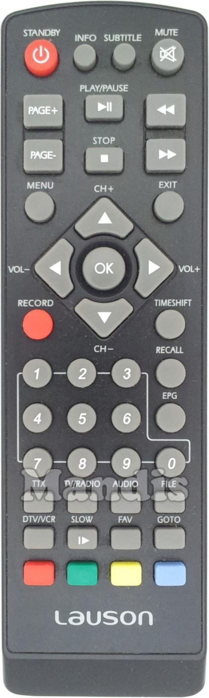 Standby, Info, Subtitle, Mute, Page+, Page-, Play/Pause, Stop, <<, >>, Menu, Exit, Record, Timeshift, Up/CH+, Down/CH-, Left/Vol-, Right/Vol+, OK, 1, 2, 3, 4, 5, 6, 7, 8, 9, 0, Recall, EPG, TTX, TV/Radio, Audio, File, DTV/VCR, I> Slow, FAV, GOTO, Red, Green, Yellow, Blue