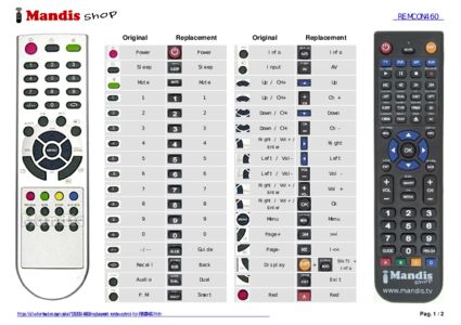 Below, we will show you the correspondence between each button on the original remote control and the button that performs the same function on the replacement remote control. In some cases, you may need to press the SHIFT key before pressing another button to perform certain actions. These additional functions are often not widely used and are included to facilitate understanding of the replacement remote control, or because the original remote control has more buttons than its equivalent.
