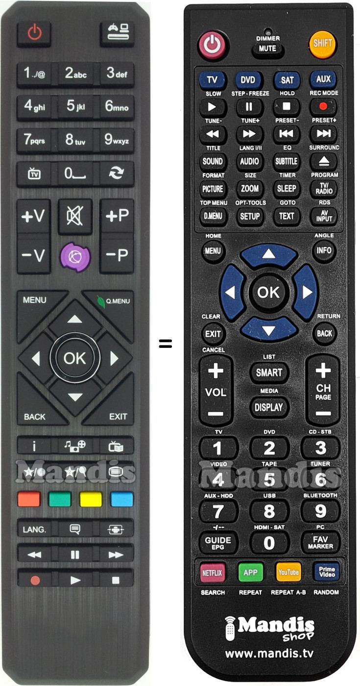 Below, we will show you the correspondence between each button on the original remote control and the button that performs the same function on the replacement remote control. In some cases, you may need to press the SHIFT key before pressing another button to perform certain actions. These additional functions are often not widely used and are included to facilitate understanding of the replacement remote control, or because the original remote control has more buttons than its equivalent.