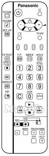 Power, Mute, Picture, Sound, Set Up, Up, Down, Vol-, Vol+, [ ⁺], TV/AV, Red, Green, Yellow, Blue, F.P., [≡i]/Index, [≡♦]/Hold/Still, 1, 2, 3, 4, 5, 6, 7, 8, 9, 0/VCR, C, -/--, Play, Stop, <<, >>, [≡]/TV/Text, Direct/TV REC, (<>), [+]/Aspect, ◳/PIP, REC, Power VCR, N, Pause/I>, Program-, Program+, STR, ?/Help