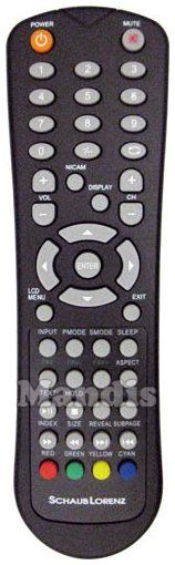 Power, Mute, 1, 2, 3, 4, 5, 6, 7, 8, 9, 0, -/--, Recall, Vol +, Vol -, Nicam, Display, CH +, CH -, Up, Left, Enter, Right, Down, LCD Menu, Exit, Input, PMode, SMode, Sleep, Fav, Fav -, Fav +, Aspect, Play/Pause / Text, Stop / Hold, Lang, Subtitle, >> / Index, << / Size, >>I / Reveal, I<< / Subpage, Red, Green, Yellow, Cyan