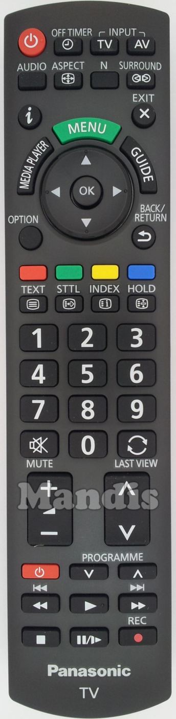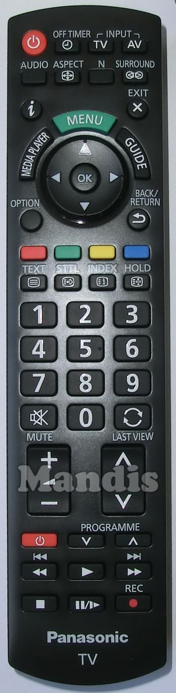 POWER, OFF TIMER, INPUT TV, INPUT AV, AUDIO, ASPECT, N, SURROUND, I, EXIT, OPTION, BACK/RETURN, OK, UP, DOWN, RIGHT, LEFT, MENU, GUIDE, MEDIA PLAYER, RED, GREEN, YELLOW, BLUE, TEXT, STTL, INDEX, HOLD, 1, 2, 3, 4, 5, 6, 7, 8, 9, 0, MUTE, LAST VIEW, VOL+, VOL-, PR+, PR-, Power↓, Programme ▼, Programme ▲, <<, >>, PLAY, STOP, PAUSE/STILL, REC