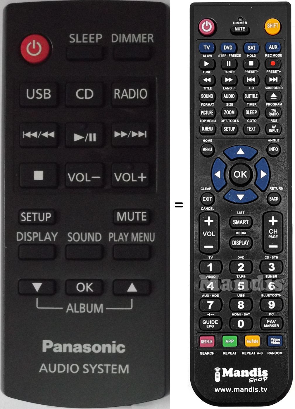 Replacement remote control Panasonic N2QAYA000015Replacement remote control Panasonic N2QAYA000015Available in stock22.73 € (VAT included)PanasonicFor DVD-S 500, DVD-S 700Replacement remote control N2QAYA000107Replacement remote control N2QAYA000107Available in stock22.73 € (VAT included)PanasonicReplacement remote control Panasonic N2QAYB000593Replacement remote control Panasonic N2QAYB000593Available in stock22.73 € (VAT included)PanasonicFor TX-P42VT30E, TX-P65VT30E, TX-P 50 VT 30 EReplacement remote control Panasonic RAK-RX314WReplacement remote control Panasonic RAK-RX314WAvailable in stock22.73 € (VAT included)PanasonicFor RAK-RX314W, RX-DT55Replacement remote control Panasonic EUR 511300Replacement remote control Panasonic EUR 511300Available in stock22.73 € (VAT included)PanasonicFor EUR511300, TX-14 B4 TC / B, TX-14 S 4, TX-28 LB 1, TX-21 AP 1 C, TX-21S3TC, TX-21 S 4 TC, TX-28 CK 2 C, TX-15 AT 1, ...Replacement remote control Panasonic N2QAYB001018Replacement remote control Panasonic N2QAYB001018Available in stock22.73 € (VAT included)PanasonicFor SC-PMX70, SA-PMX7, SC-PMX74, SC-PMX100B, SCPMX74EG, SCPMX100EGS, SA-PMX70BEBReplacement remote control N2QAYB000150Replacement remote control N2QAYB000150Available in stock22.73 € (VAT included)PanasonicReplacement remote control Panasonic N2QAYB000640Replacement remote control Panasonic N2QAYB000640Available in stock22.73 € (VAT included)PanasonicFor SCPM5, SC-PM500, SCPM500EG, SC-PMX5, SC-HC25EG-K, SA-PMX5EG, SA-PM500EF, SC-PMX5DBReplacement remote control RC115331300Replacement remote control RC115331300Available in stock22.73 € (VAT included)PanasonicReplacement remote control Panasonic EUR7720X40Replacement remote control Panasonic EUR7720X40Available in stock22.73 € (VAT included)PanasonicFor NV-VP32Replacement remote control Panasonic N2QAJB 000069Replacement remote control Panasonic N2QAJB 000069Available in stock22.73 € (VAT included)PanasonicFor DVDS31EG, DVDS31EGS, DVDS35E, DVDS35EGS, DVD-S 35 EG, N2QAJB000069Replacement remote control Panasonic EUR 501302Replacement remote control Panasonic EUR 501302Available in stock22.73 € (VAT included)PanasonicFor EUR501302, TC-14S1RFReplacement remote control Panasonic N2QAYC000064Replacement remote control Panasonic N2QAYC000064Available in stock22.73 € (VAT included)PanasonicFor SC-HTB20EGReplacement remote control Panasonic N2QAYC000080Replacement remote control Panasonic N2QAYC000080Available in stock22.73 € (VAT included)PanasonicFor SC-HC18EG-K, SC-HC18, SCHC18DBEGKReplacement remote control Panasonic N2QAYB000509Replacement remote control Panasonic N2QAYB000509Available in stock22.73 € (VAT included)PanasonicFor DMPBDT300EE, DMP-BDT300EG, DMP-DBT330Replacement remote control Panasonic RC202361101BReplacement remote control Panasonic RC202361101BAvailable in stock22.73 € (VAT included)PanasonicFor 19PFL432293, 20HF400593, 20PFL412279, 20PFL412293, 20PFL412298, 26TA280079, 26TA280093, 26TA280098, 32HF201097, TC 25 L 10 R, ...Original remote control PANASONIC N2QAYB001261Original remote control PANASONIC N2QAYB001261Available in stock29.70 € (VAT included)PanasonicFor Hi-Fi system RXD-552EOriginal remote control PANASONIC N2QAYB001135Original remote control PANASONIC N2QAYB001135Available in stock33.00 € (VAT included)PanasonicFor Hi-Fi system SC-PMX150EGSOriginal remote control PANASONIC N2QAYB001204Original remote control PANASONIC N2QAYB001204Available in stock33.00 € (VAT included)PanasonicFor Hi-Fi system SC-HC2040EGW, SC-HC2020EGK, SC-HC2040EGK, SC-HC2020EBKOriginal remote control PANASONIC N2QAYC000131Original remote control PANASONIC N2QAYC000131Available in stock36.00 € (VAT included)PanasonicFor Soundbar SC-HTB510EG