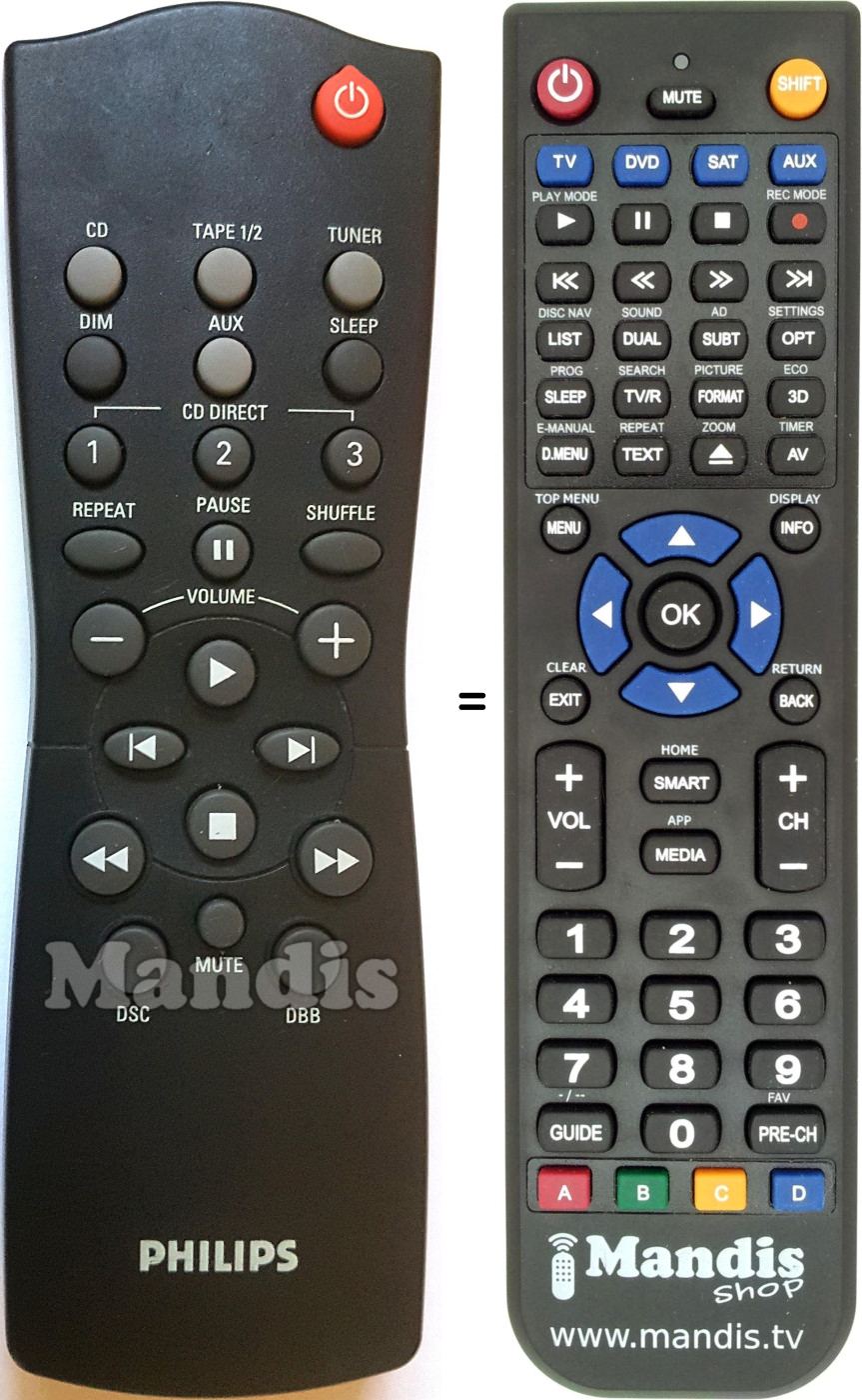 This remote control performs all the functions of the original remote control: Power, DIM, Sleep, CD Direct 1, CD Direct 2, CD Direct 3, Pause, Repeat, Shuffle, Vol-, Vol+, Play, I<, >I, Stop, <<, >>, DSC, DBB, Mute