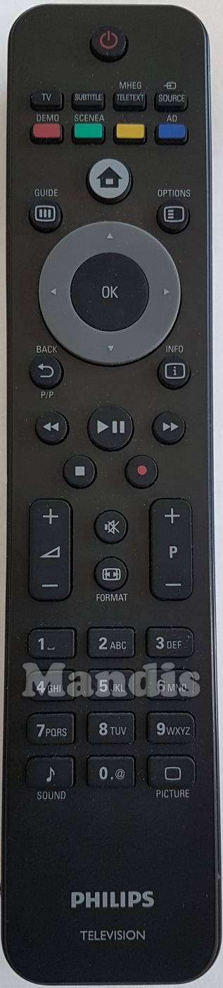 Power, TV, Subtitle, Teletext/MHEG, Source, Red/Demo, Green/Scenea, Yellow, Blue/AD, Home, Guide, Options, Up, Down, Right, Left, OK, Back/P/P, Info, Play/Pause, <<, >>, Stop, Rec, Mute, [<>]/Format, Vol+, Vol-, P+, P-, 1, 2, 3, 4, 5, 6, 7, 8, 9, 0, ♪/Sound, [ ]/Picture