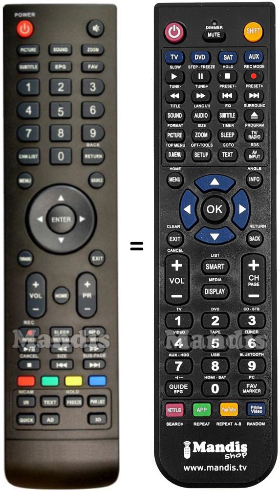 Below, we will show you the correspondence between each button on the original remote control and the button that performs the same function on the replacement remote control. In some cases, you may need to press the SHIFT key before pressing another button to perform certain actions. These additional functions are often not widely used and are included to facilitate understanding of the replacement remote control, or because the original remote control has more buttons than its equivalent.