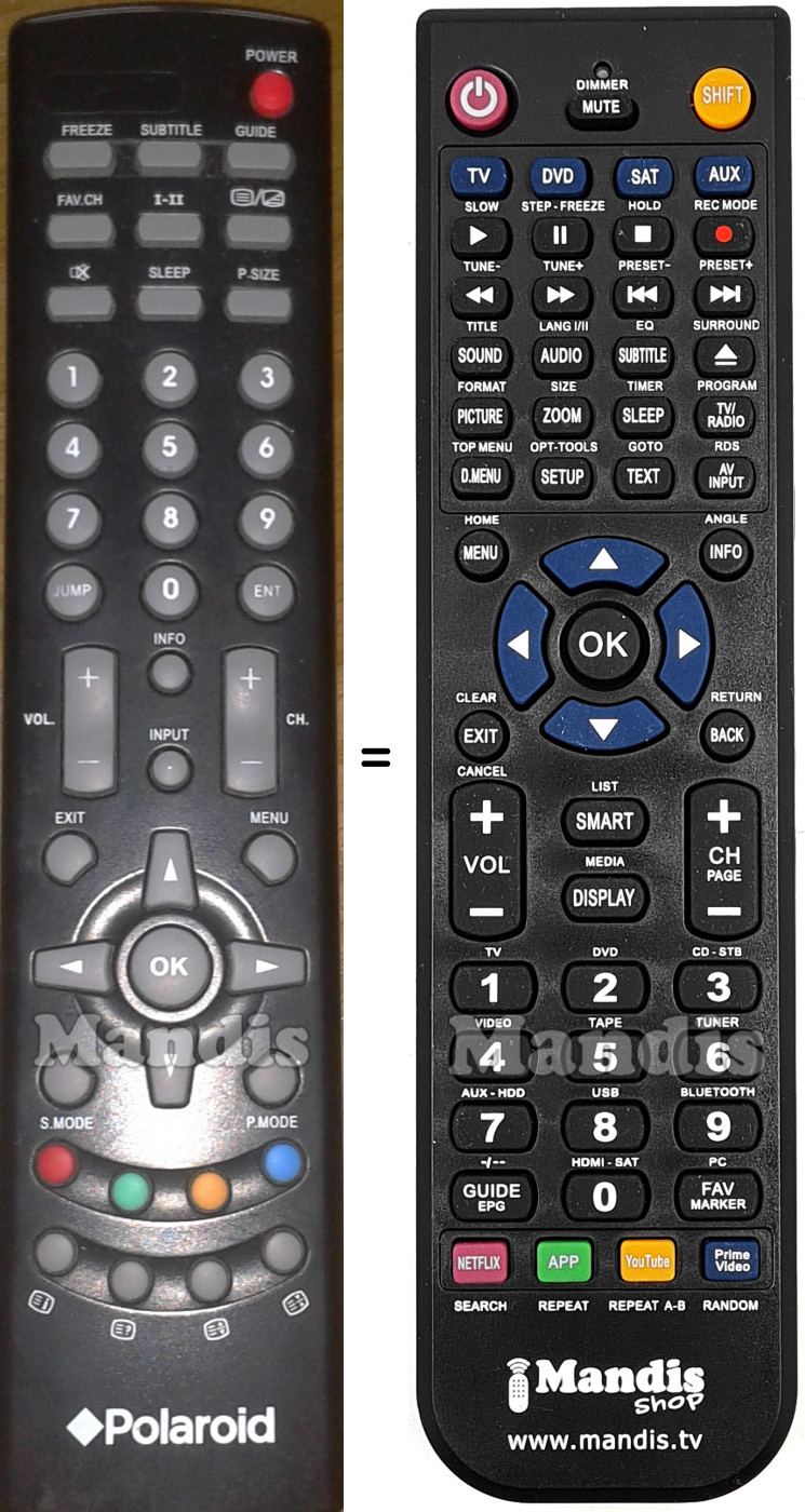 Below, we will show you the correspondence between each button on the original remote control and the button that performs the same function on the replacement remote control. In some cases, you may need to press the SHIFT key before pressing another button to perform certain actions. These additional functions are often not widely used and are included to facilitate understanding of the replacement remote control, or because the original remote control has more buttons than its equivalent.